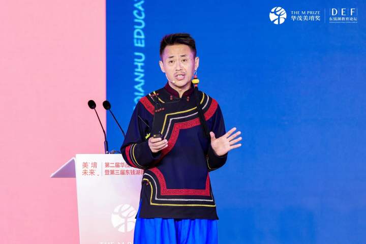 除了社会美育“启示录”,还展示了校园美育多元“图鉴”。其中,致力于“开发儿童潜能”的教育家杨景芝,讲述研究半个世纪的儿童美术教育成果,用情感教育灌溉儿童心灵;“彝族歌海拾珠人”翁姑木衣,以一曲质朴自然的彝歌,娓娓道来青少年彝文化传承之歌;坚守乡村20余年的音乐教师陈晓雯,将现实版“放牛班的春天”故事搬上舞台;重庆市特殊教育中心校长李龙梅,“解锁”视障儿童在北京冬残奥会上“盲奏”的背后故事;扎根乡村美育40年的“麦田守望者”朱永,展示了“农村娃”从田埂飞向国外的绘画梦;西安市铁一中学艺体中心主任罗琦,放下指挥棒,拿起话筒,开讲一所西部普通中学的“音乐出海记”。